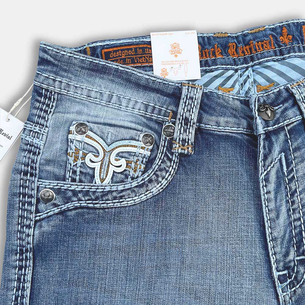 Designed with precision, these jeans feature the signature Rock Revival “R” embroidery and fleur-de-lis pattern on both back pockets. The detailed stitching in shades of orange, white, and silver creates a striking 3D contrast against the deep blue denim. Each stitch is reinforced for durability, highlighting the craftsmanship that Rock Revival is known for. The embossed metal rivets, thick seams, and branded leather patch complete the Western aesthetic.