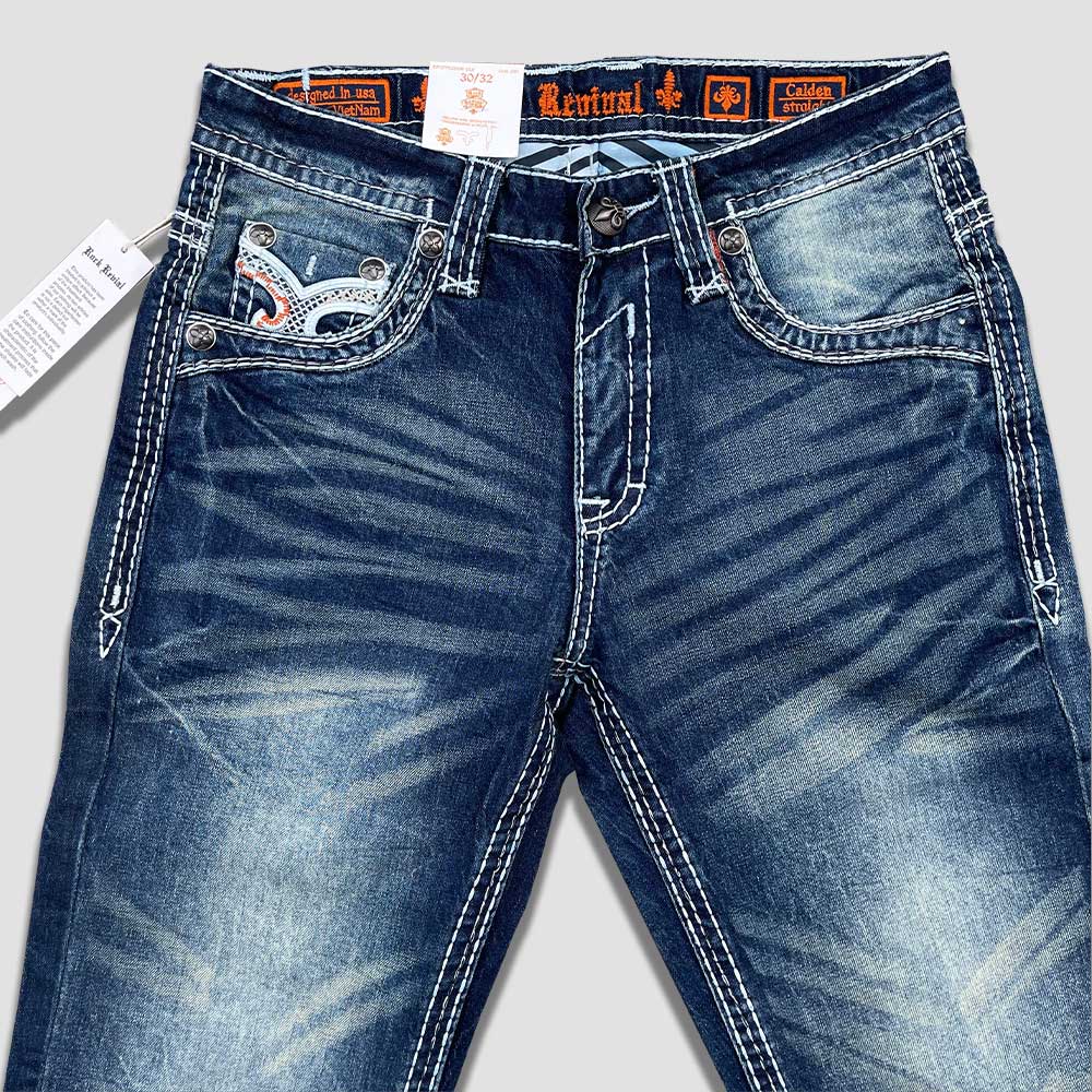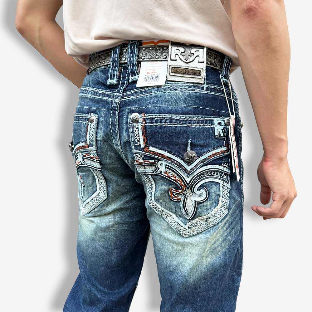 Every detail speaks of heritage and hard work. The back pockets feature signature Rock Revival “R” embroidery in white and orange contrast threads — a symbol of rugged individuality. Thick, heavy stitching traces along every seam, giving these jeans their distinctive cowboy edge. The distressed indigo wash and vintage fade patterns reflect hours on the saddle, making each pair unique, just like the man who wears them.