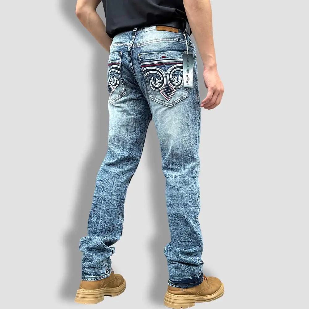 Every pair of cowboy jeans is built with high-precision stitching and a durable fabric blend that holds its shape. The red, white, and blue embroidered back pockets highlight classic Western artistry, while the faded light wash gives a timeless distressed look.